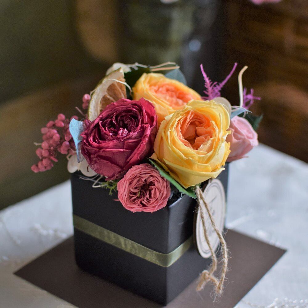スタイリッシュでおしゃれなブラックベースのプリザーブドフラワーアレンジ。